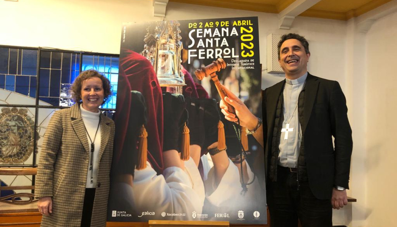 Cofrades y autoridades lanzaron en la mañana de este sábado la Semana Santa de Ferrol de 2023 con la presentación del cartel promocional, protagonizado este año por la Cofradía de la Merced a través de una fotografía de un detalle del trono del Redentor. Su autora, Alejandra Varela, expresaba su felicidad por haber sido la ganadora del concurso. "Gracias con mayúsculas porque estoy viviendo un sueño". La imagen recoge el momento en el que el mayordomo va a dar un toque de campana para dar indicaciones a los portadores "Es uno de los sonidos más especiales de la Semana Santa, esa comunicación que se establece entre el mayordomo y los portadores y entre el mayordomo y los espectadores", explicó en el acto celebrado en el Casino. "Deseo que las personas que vean este cartel puedan sentir y escuchar su mensaje. Para mí representa una doble llamada, la llamada a la promoción y a la participación en nuestra Semana Santa ferrolana y esa otra llamada a la fe que, sí o sí, todos acabamos sintiendo en algún momento de nuestras vidas".