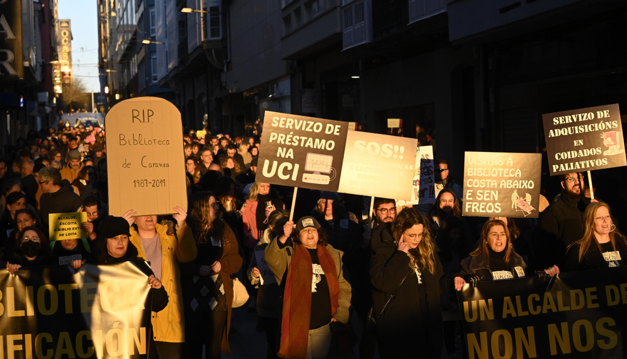 Los apoyos que desde el 1 de enero –cuando concluyeron su contrato cuatro auxiliares administrativos contratados en abril para paliar la merma de personal– se han ido sucediendo de forma directa o en las redes se plasmó ayer en una manifestación. Así, cerca de trescientas personas, entre las que se encontraban representantes de todos los grupos políticos de la oposición –PP, FeC y BNG–, representación sindical del Concello o entidades y particulares del mundo de la cultura, apoyaron a los trabajadores en esa “resistencia” al desmantelamiento del servicio, que se ha venido sucediendo en los últimos tiempos y que supone una menor prestación de servicios y una apertura en horario reducido, llegando incluso a cerrar por las tardes.