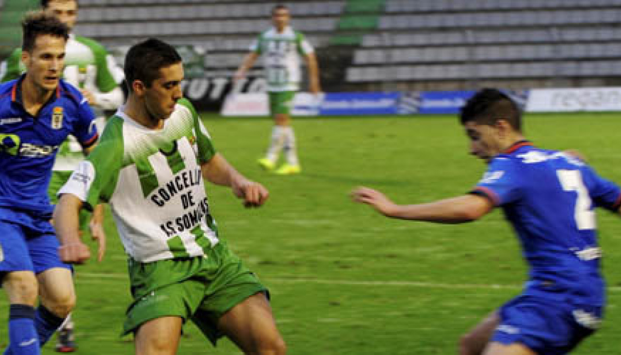 David estuvo a punto de darle un susto a Goliat. El Somozas, el equipo del pueblo más pequeño que tiene representación en Segunda B, que con la plantilla más económica de la categoría lucha por la salvación, se quedó a un paso de sorprender al Oviedo, el líder del campeonato, formado por los mejores jugadores de la división y que cuenta con el respaldo de una masa social diez veces mayor que todos los habitantes de As Somozas. El fútbol, sin embargo, no son núemeros y el cuadro verdiblanco, a pesar de los dos goles que recibió durante el primer cuarto de hora y de jugar en un campo distinto al suyo, hizo méritos para recuperar el empate en el marcador y poner en aprietos a una escuadra que solo fue capaz de ganar gracias a una acción más que polémica.
